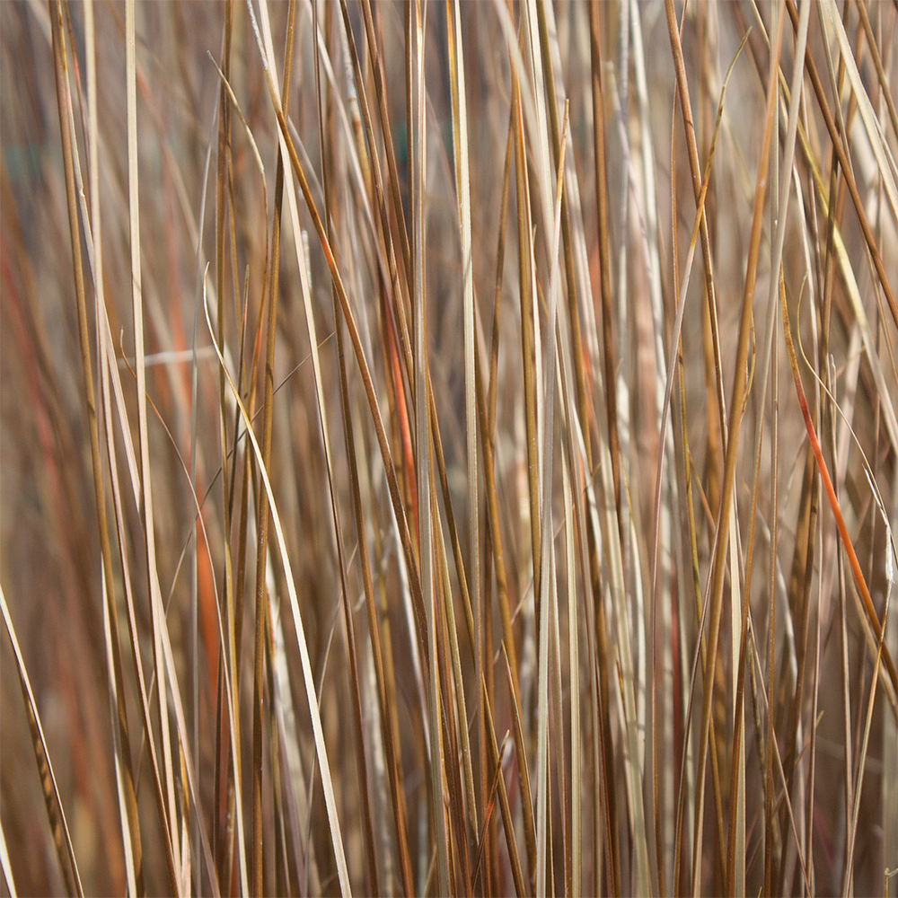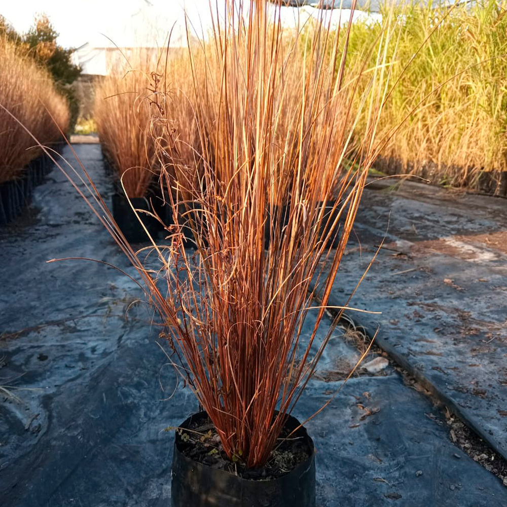 Gramínea perenne de hábito erguido, forma matas densas y estilizadas diferenciándose de otras variedades por ser menos arqueada y más resistente al frío. Prefiere una exposición a pleno sol para intensificar sus tonos cobrizos y rojizos, aunque tolera la semisombra, y requiere suelos con humedad constante pero bien drenados. No soporta el encharcamiento invernal. Debido a su follaje fino y coloración terrosa, es muy valorado como elemento ornamental en jardines modernos, rocallas y macetas, donde destaca especialmente al ser combinado con plantas de follaje plateado o verde intenso para crear contrastes de textura y movimiento.