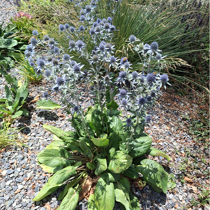Herbácea perenne de alto impacto visual, conocida por su abundante producción de flores cónicas y tallos de un intenso azul acero metálico que alcanzan hasta 1 metro de altura. Requiere una exposición a pleno sol y suelos con excelente drenaje, aguanta la salinidad costera y se adapta a terrenos pobres o arenosos donde otras plantas fallarían. Es ideal para aportar textura y verticalidad en macizos de estilo naturalista o jardines de grava y rocallas, además puede utilizarse como flor de corte y flor seca, ya que mantiene su color y forma por mucho tiempo después de ser cosechada.